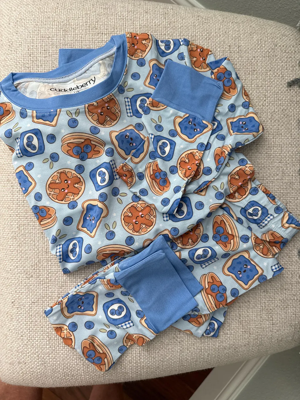 These blueberry jam pjs will be comfy for our 4 yr old granddaughter to wear. She’s all about the book “More Blueberries” so the cute pattern will be fun for her, too. The order arrived quickly.